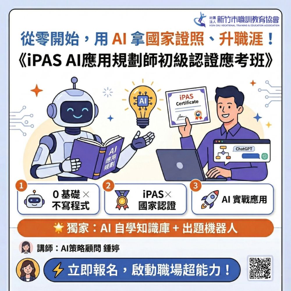 iPAS AI應用規劃師初級認證應考班(14H)✨另考照政府補助費用減半!✨